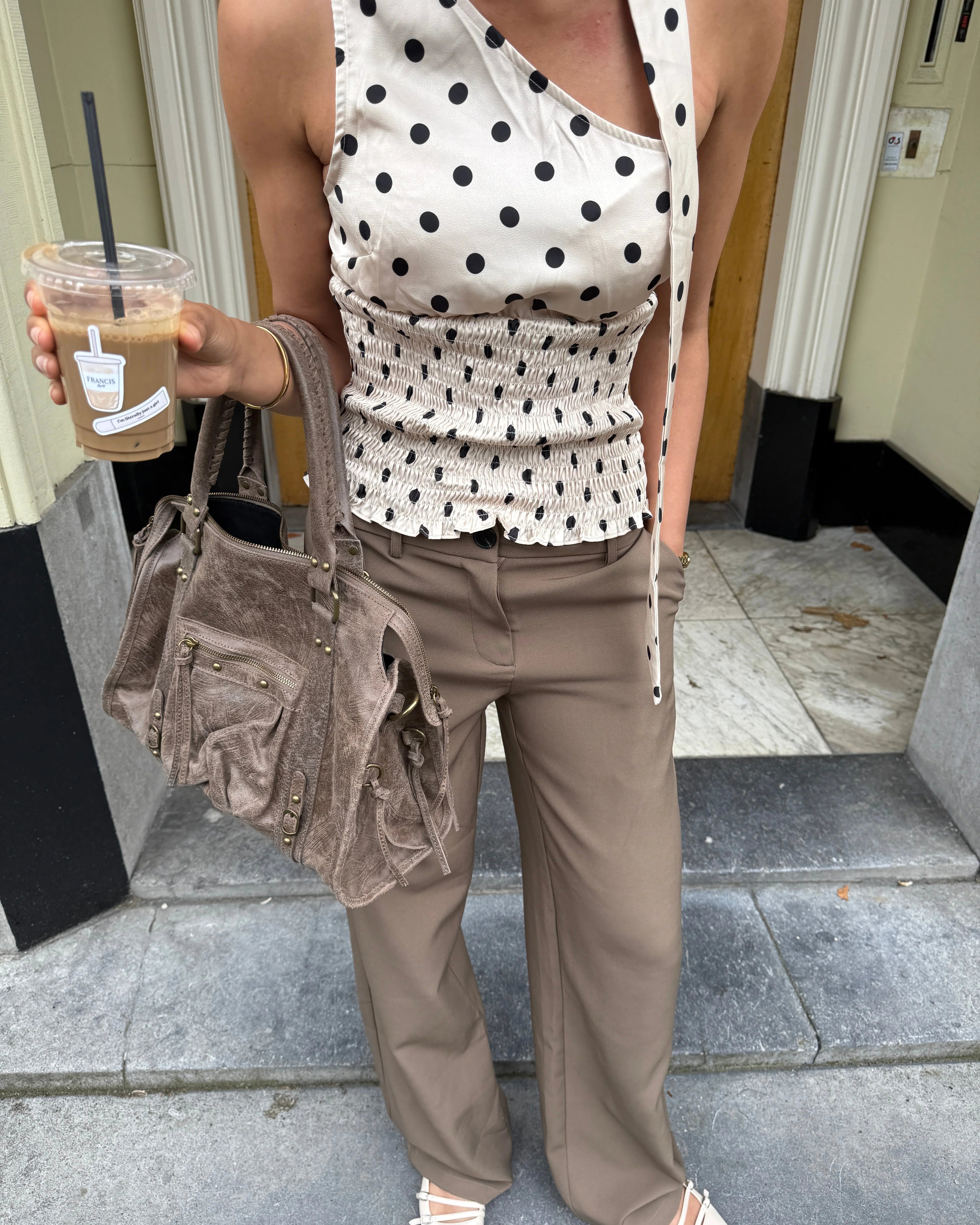- Hardware: Gold-tone details
