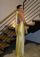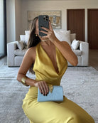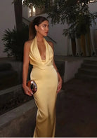 Step into effortless glamour with our Golden Elegance Dress. Crafted from a smooth, figure-enhancing fabric, this dress combines a graceful cowl neckline with a flattering halter style that beautifully highlights your shoulders and back.