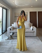 The floor-length silhouette flows with ease, creating a timeless look that’s perfect for weddings, galas, or any special event. Its golden hue radiates confidence and sophistication, ensuring you’ll be the star of every occasion.